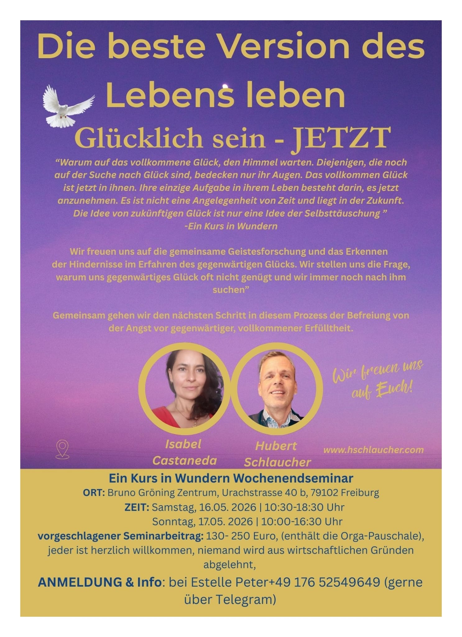 Wir freuen uns auf die gemeinsame Geistesforschung und das Erkennen der Hindernisse im Erfahren des gegenwärtigen Glücks. Wir stellen uns die Frage, warum uns gegenwärtiges Glück oft nicht genügt und wir immer noch nach ihm suchen”
