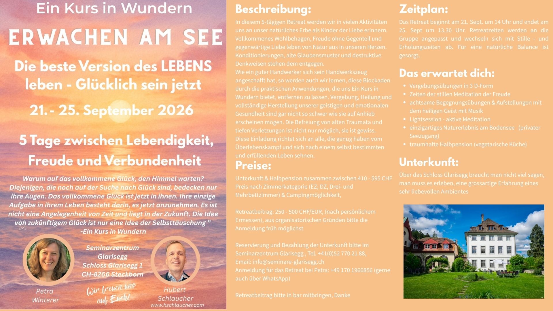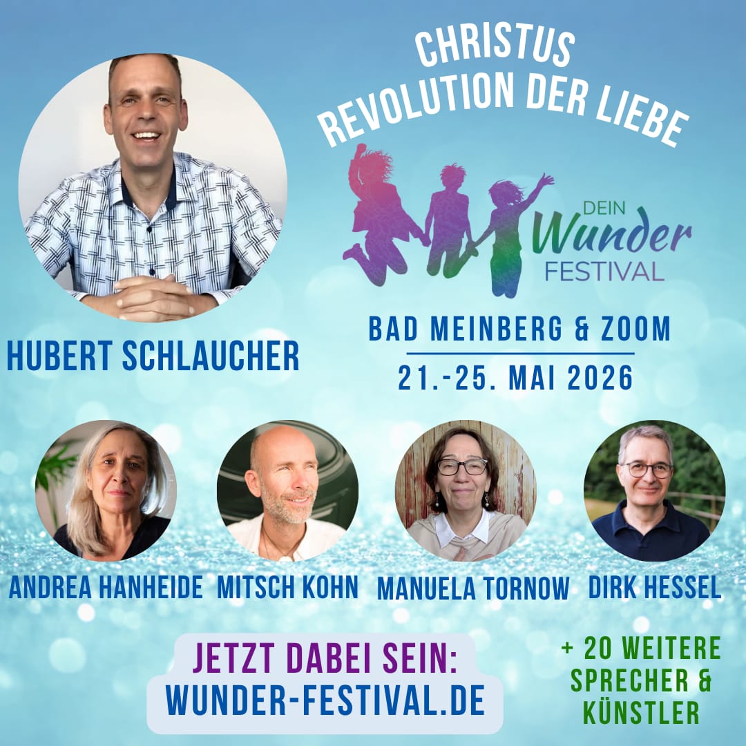 Wir laden dich von ganzem Herzen ein zu einem Wochenende voller Begegnung, Heilung und Wunder. Zusammen betrachten wir unsere Beziehungen in der Welt, lassen uns berühren und trösten von der Vergebung und erinnern gemeinsam die Gnade der Einheit mit Gott und seinem ewigen Frieden und seiner ewigen Liebe.